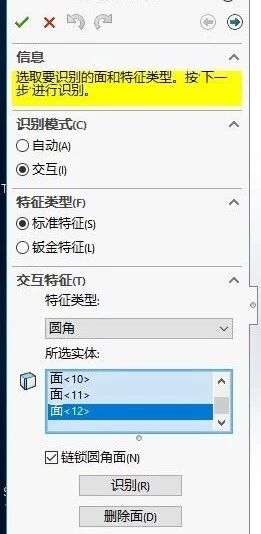 您可以使用交互及自动特征识别来识别如圆角、拉伸切除、孔和拉伸凸台之类的特征。