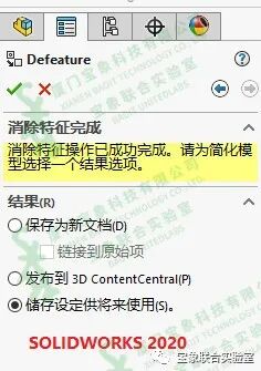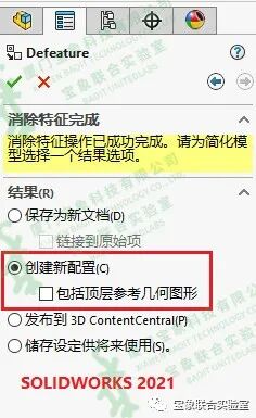 在SOLIDWORKS 2021中,使用工具 > defeature > 侧影轮廓方法来消除特征时,在消除特征完成页可以选择创建新配置。在父配置下,只能有一个消除特征配置。