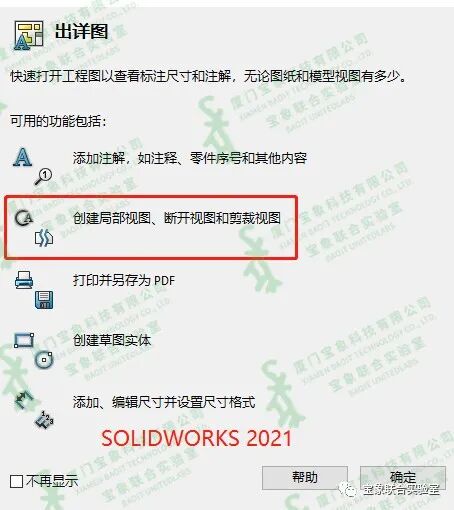 SOLIDWORKS 2021中,出详图模式下创建的尺寸和注解会更新以反映您对模型所做的更改。此外,增加了创建和修改断开视图、剪裁视图和局部视图。