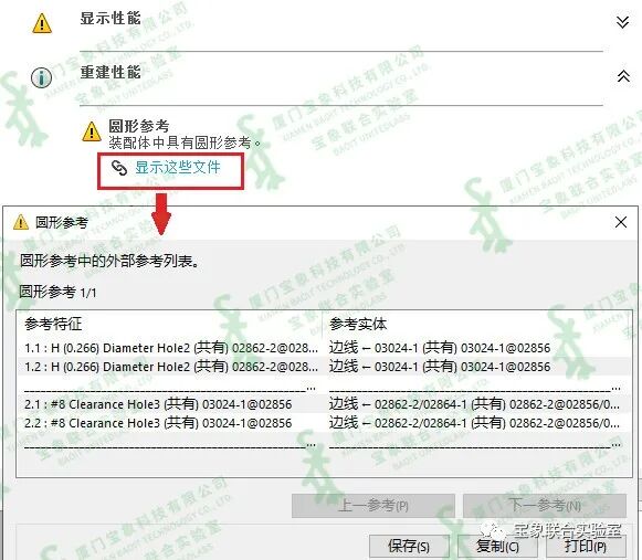 性能评估可以帮助我们洞察可能导致性能下降的设计领域。SOLIDWORKS 2021中,性能评估将检测装配体中的循环参考引用,我们可以利用这些信息进一步优化设计并解决问题。
